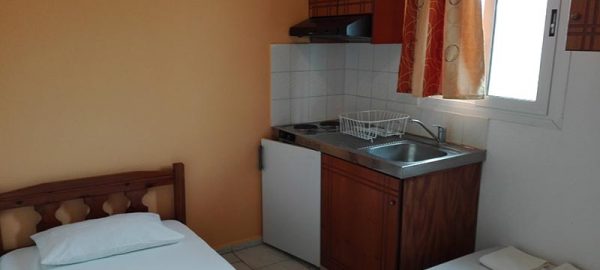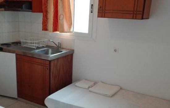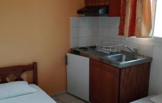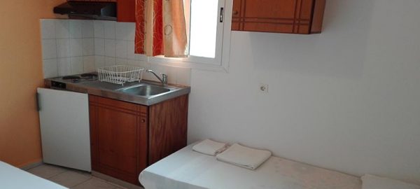 Апартманот располага со две простории. Првата просторија е кујната која е комплетно опремена со кујнски инвентар, ел.шпорет без рерна, аспиратор, фрижидер и има 1 поединечен кревет. Во втората просторија има 2 поединечни кревети со можност за дополнителен кревет, плакар за алишта, тв, клима и излегува на тераса на која има маса со столици и тенда, со поглед во убавата градина. Апартманот располага со стандардно купатило и вц.
